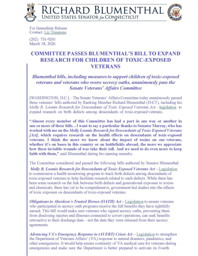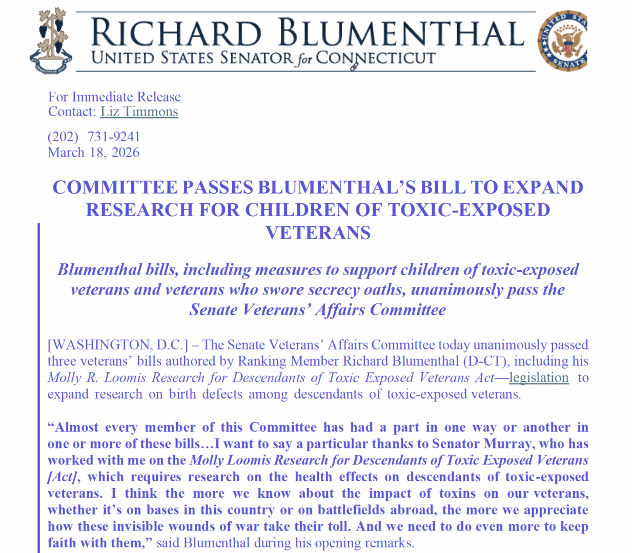 Senators Blumenthal (CT) and Murray (WA), thank you for your leadership on this issue and reintroducing the bill and members of the Veterans’ Affairs Committee, Senators Moran (KS), Boozman (AR), Cassidy (LA), Tillis (NC), Sullivan( AK), Blackburn (TN), Cramer (ND), Tuberville (AL), Banks (IN), Sheehy (MT), Sanders (VT), Hirono (HI), Hassan (NH), Duckworth (IL), Gallego (AZ), and Slotkin (MI), thank you so much for your support, concern and attention to this issue. (In addition to Congresswoman Dingell, who has brought the bill to the House, and Senators Schiff, Booker, Rosen, and Whitehouse who have also signed on as co-sponsors despite not being on the VA committee.)